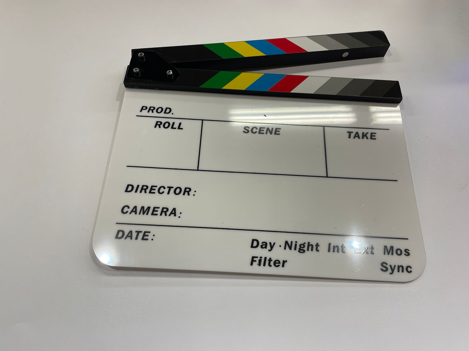 The 9-Section Acrylic Production Slate with Color Clapper Sticks from Elvid is a production slate made of white acrylic designed to be used with dry erase markers. It uses standard-size color clapper sticks to provide visual and audio sync points when using a separate device to record audio (dual-system sound). The full slate measures 9.25 x 11" and features engraved text and lines.