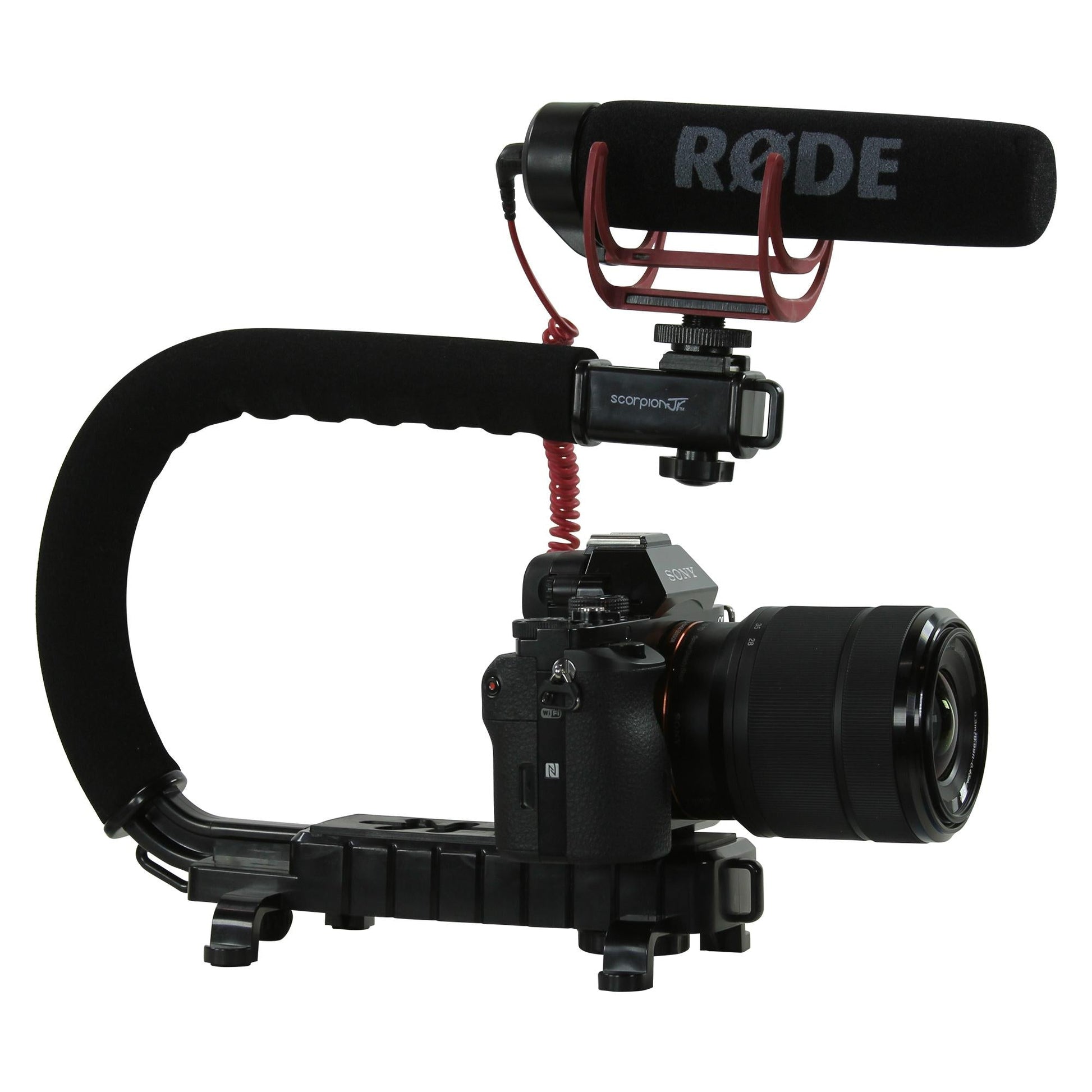 The Scorpion JR. Triple Shoe Camera Stabilizer is the perfect solution for all your accessory mounting needs. The Triple Shoe Accessory Mount provides plenty of room to mount LED lights Microphones and more in a compact handheld rig. The Scorpion JR Steadicam Camera Handle features a comfortable neoprene grip that supports cameras up to 4.5 lbs. In addition, the Scorpion JR steady cam also features a collapsible design, separate the base from the handle for easy storage in your camera bag.